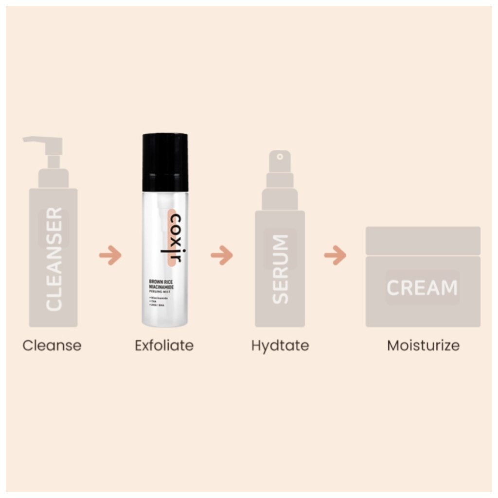 Coxir Brown Rice Niacinamide Peeling Mist je exfoliačný toner s obsahom AHA a BHA kyselín, ktoré efektívne odstraňujú odumreté bunky z povrchu pokožky, prečisťujú póry a prispievajú k redukcii ich viditeľnosti.