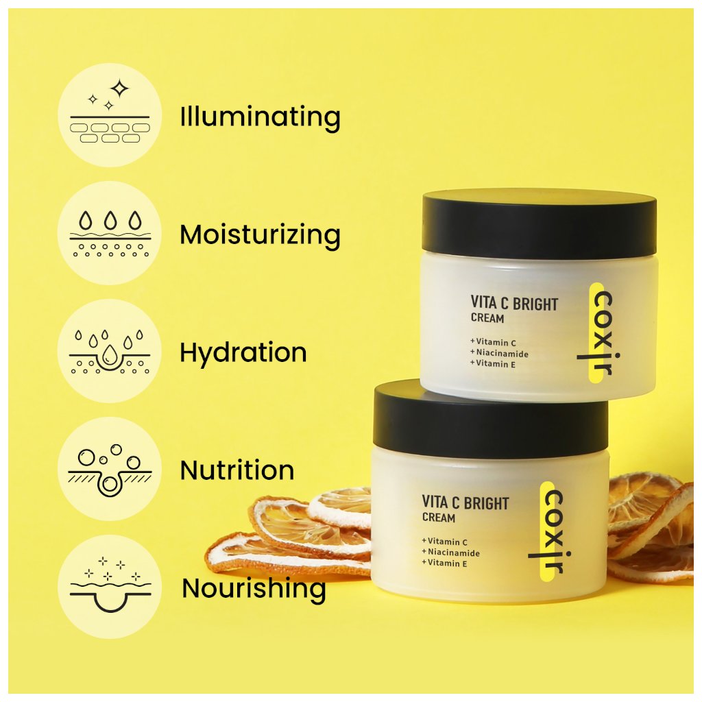 - Vitamín C je antioxidant, ktorý rozjasňuje pleť a podporuje tvorbu kolagénu, čím prispieva k pevnejšej a pružnejšej pokožke; pomáha redukovať tmavé škvrny, pigmentové nerovnosti a stopy po akné, zjednocuje tón pleti a dodáva jej svieži, zdravý vzhľad; chráni kožné bunky pred poškodením voľnými radikálmi a predčasným starnutím