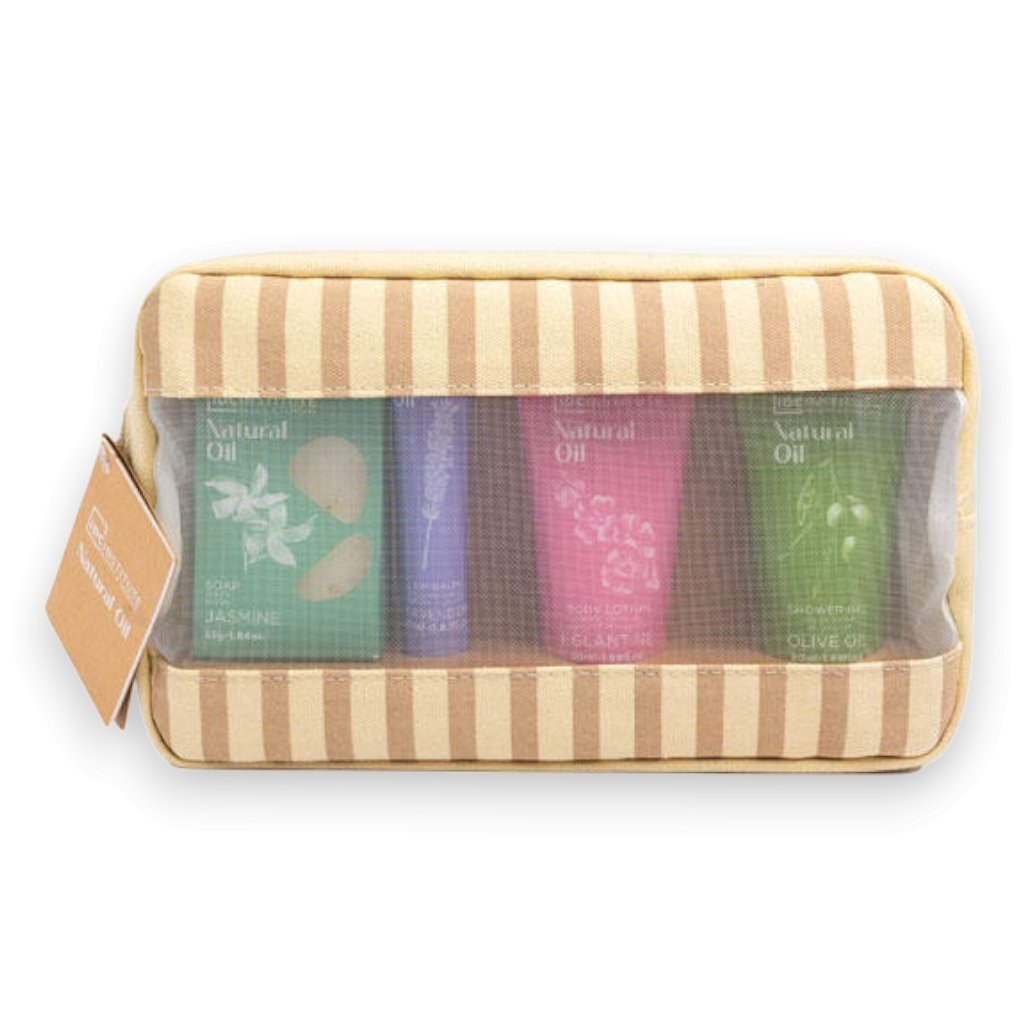 Praktická cestovná sada v sebe spája každodennú starostlivosť o telo v štýlovej prenosnej kozmetickej taštičke. Set obsahuje sprchový gél, hydratačné telové mlieko, balzam na pery a jemné mydlo. Vďaka prírodne inšpirovanému zloženiu poskytuje pokožke výživu, hydratáciu a sviežosť kdekoľvek na cestách. Sada je ideálna do kabelky, batoha, na víkendové pobyty aj dovolenky.