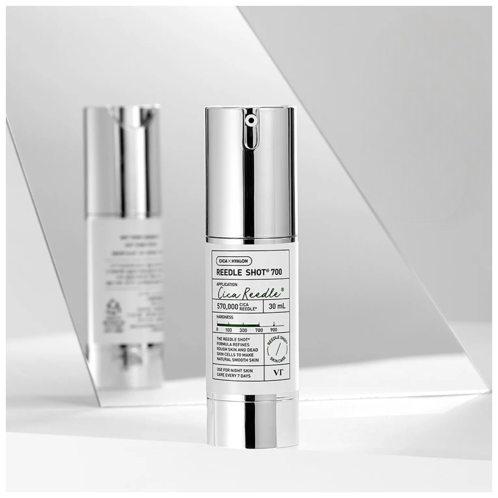 VT Cosmetics Mikroihličkové sérum 700 je vysoko účinné pleťové sérum s technológiou Cica Reedle™, ktorá využíva jemné mikroihličky pre komplexnú starostlivosť o pleť. Vysoká koncentrácia mikroihličiek v zložení zlepšuje vstrebávanie kyseliny hyaluronovej, výťažkov z pupočníka ázijského, aminokyselín, adenozínu a vitamínu B3. Okamžite stimulujú tvorbu kolagénu, regeneráciu pleti a dodávajú pružnosť a vitalitu.